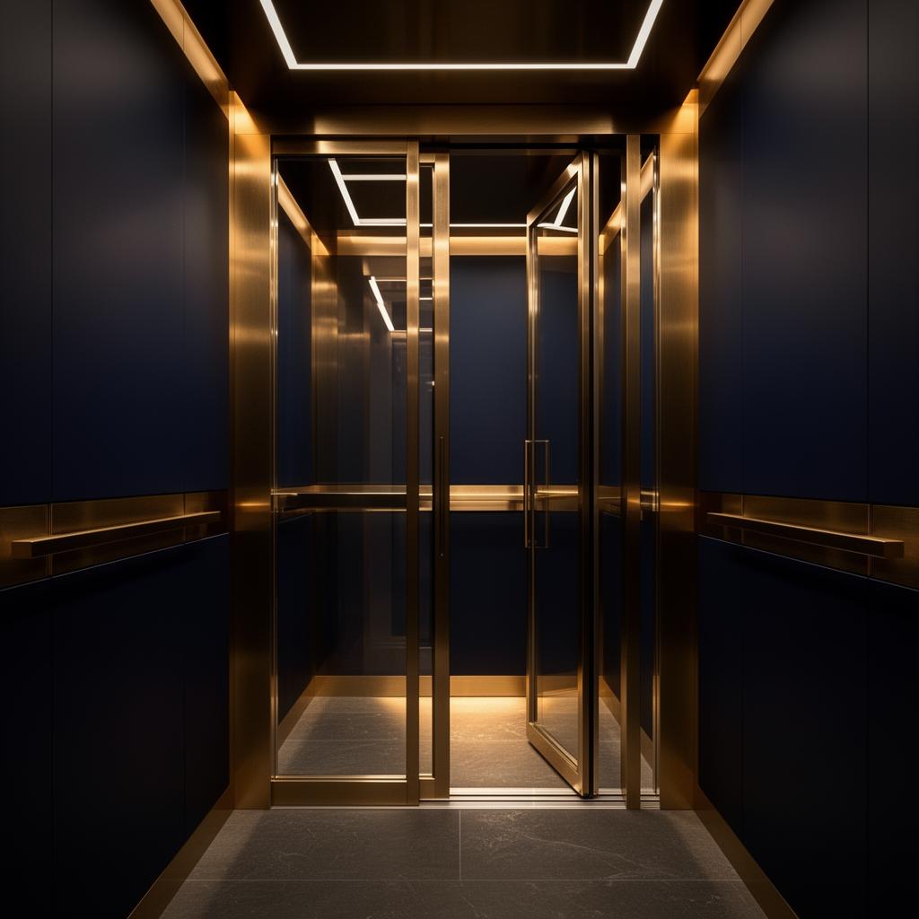 كابينات مصاعد فاخرة بتصاميم داخلية متعددة، مرايا، إضاءة LED، ولمسات ستانلس وذهبي.